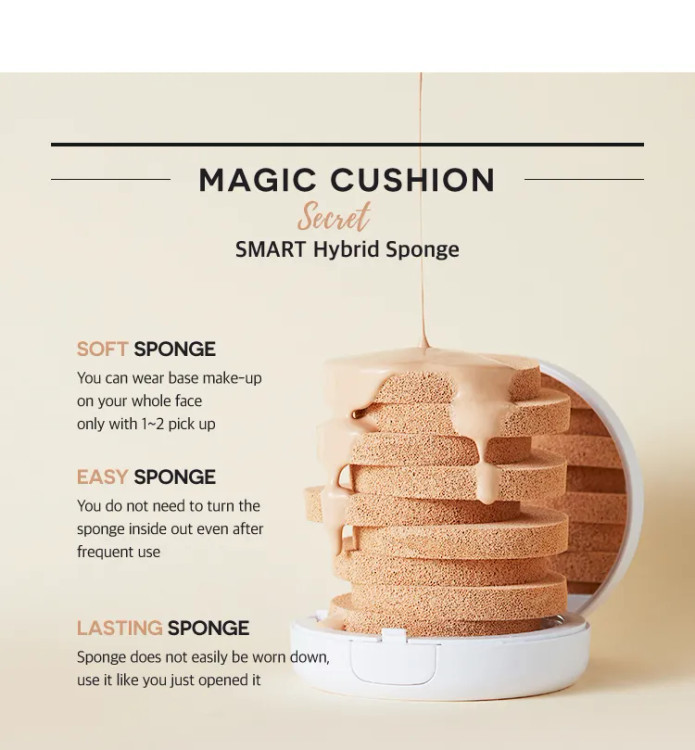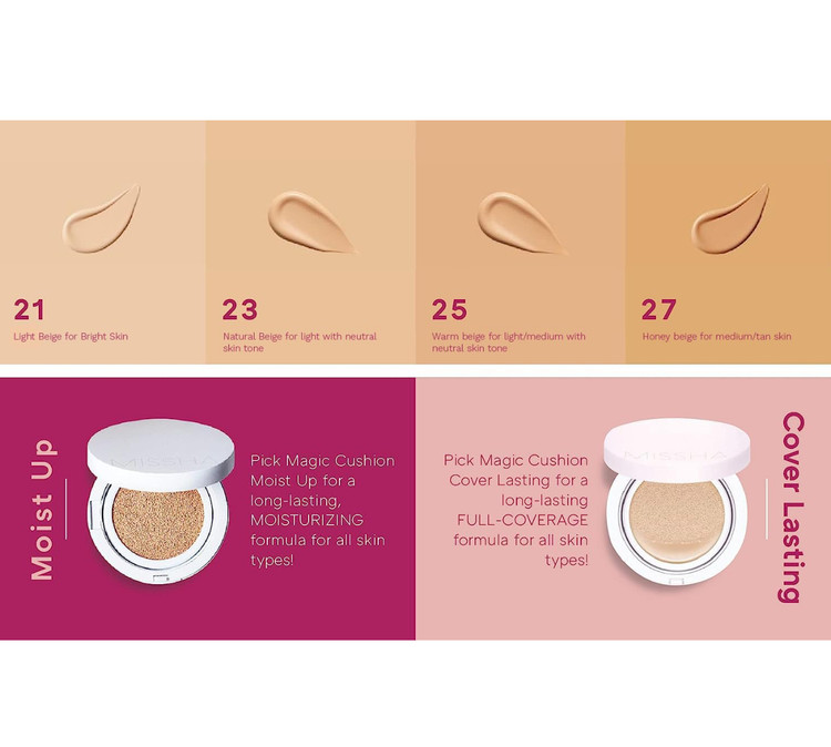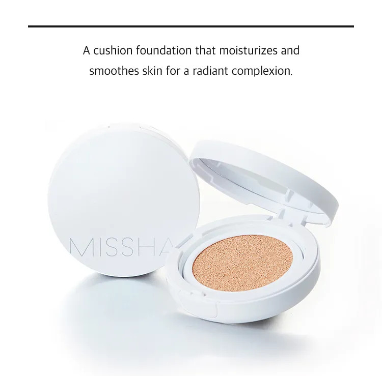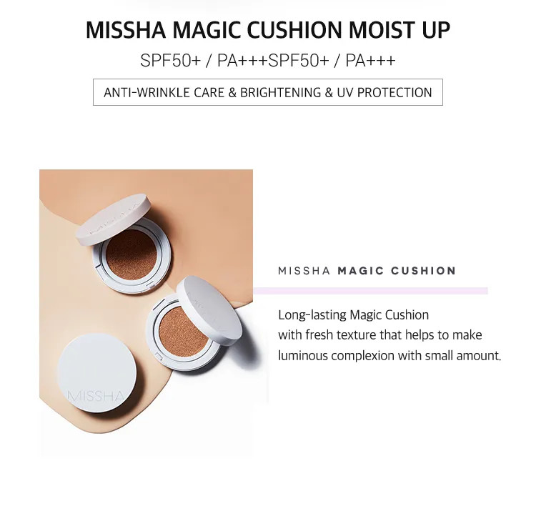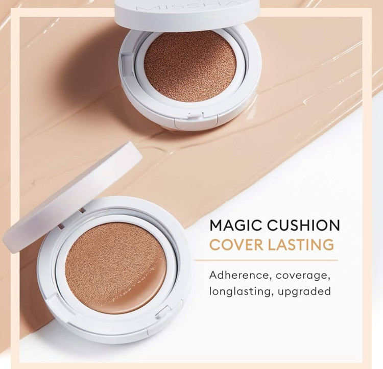 کوشن مجیک میشا، یک کرم پودر کرهای است که کاور و ماندگاری بسیار بالایی داشته و فینیش آن روی پوست نیمه مات میباشد. دارای SPF50 و PA+++ است که از پوست در برابر اشعههای مضر نور خورشید محافظت کرده و مانع از آفتاب سوختگی میشود. تنها مقدار کمی از این محصول بافت و سطح پوست را صاف و یکدست کرده و به خوبی روی پوست فیکس میشود. حاوی ترکیبات گیاهی است که پوست را رطوبترسانی و مرطوب کرده تا در عین ایجاد فینیش مات موجب خشک شدن پوست نشود.