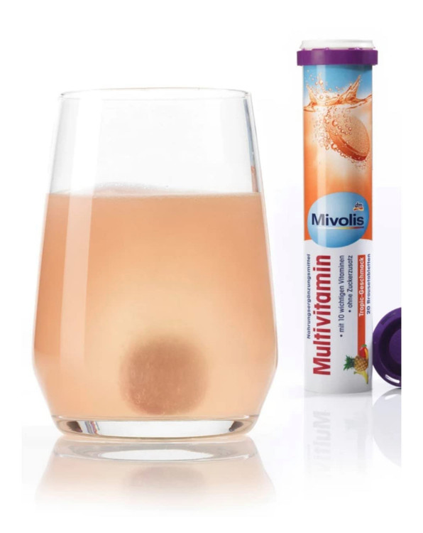 قرص جوشان مولتی ویتامین موولیس حاوی 10 ماده معدنی و ویتامین های موردنیاز بدن است که با تامین روزانه ی آن ها به افزایش سلامت عمومی بدن، تقویت سیستم ایمنی، تولید انرژی و حفظ سلامت کمک می کند. این قرص جوشان با طعم خاص و دلپذیر میوه های استوایی بوده و بسیار خوش طعم و خوشمزه می باشد، همچنین فاقد شکر بوده و برای بیماران دیابتی نیز قابل استفاده است. قرص جوشان مولتی ویتامین Mivolis با داشتن بیوتین به حفظ سلامت و جلوگیری از ریزش مو، با فولید اسید به درمان کم خونی و با داشتن ویتامین های گروه ب به افزایش انرژی کمک شایانی خواهد کرد. همچنین وجود ویتامین C در این قرص جوشان به حفظ سلامت پوست و تولید کلاژن کمک کرده و ترکیب آن با ویتامین E نیز باعث داشتن خاصیت آنتی اکسیدانی قوی و مبارزه با رادیکال های آزاد خواهد شد. کاهش خطر ابتلا به بیماری ها مزمن، استفاده آسان و بدون ایجاد عوارض گوارشی، قابلیت استفاده در نوجوانان و ورزشکاران، از بین بردن عفونت ها و تولید گلبول های قرمز از دیگر ویژگی های قرص جوشان میولیس به شمار می رود.