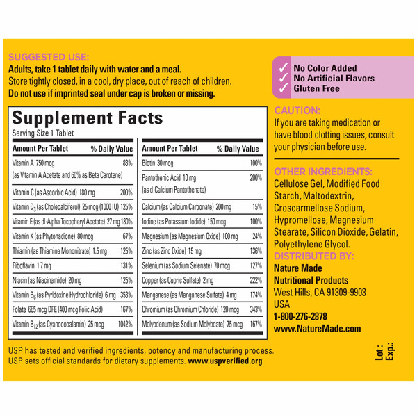 به طور معمول، مواد مغذی موجود در این مولتی ویتامین در یک رژیم غذایی یافت می شود که غذاهای متنوعی از جمله مصرف فراوان سبزیجات و میوه، غلات کامل و پروتئین بدون چربی را فراهم می کند.